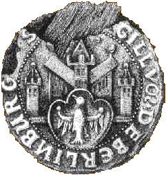 Berlins erstes bekannte Siegel aus dem Jahre 1253 zeigt den brandenburger Adler vor einem dreitürmigen Stadttor. Die Inschrift lautet: "sigillum de berlin burgensis" (Das Siegel der Bürger Berlins).